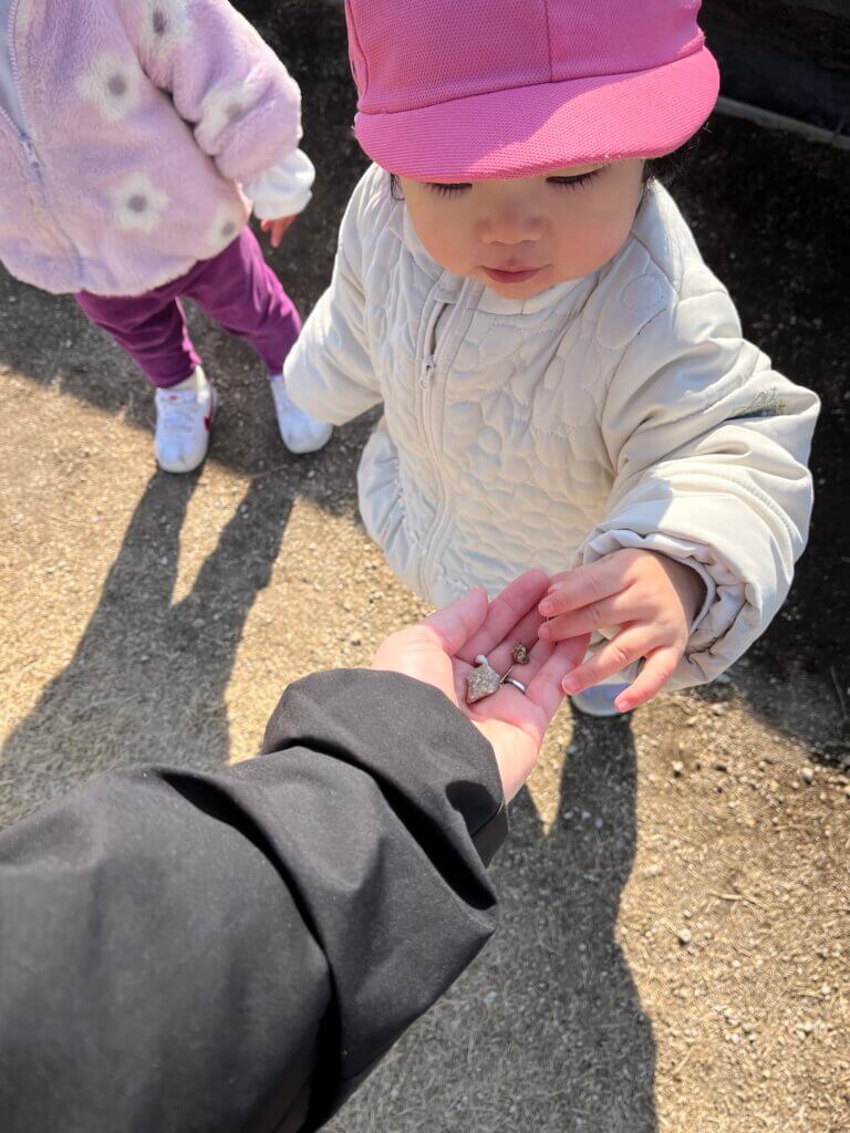 拾った小石や葉っぱを並べたり渡してくれたりしています。