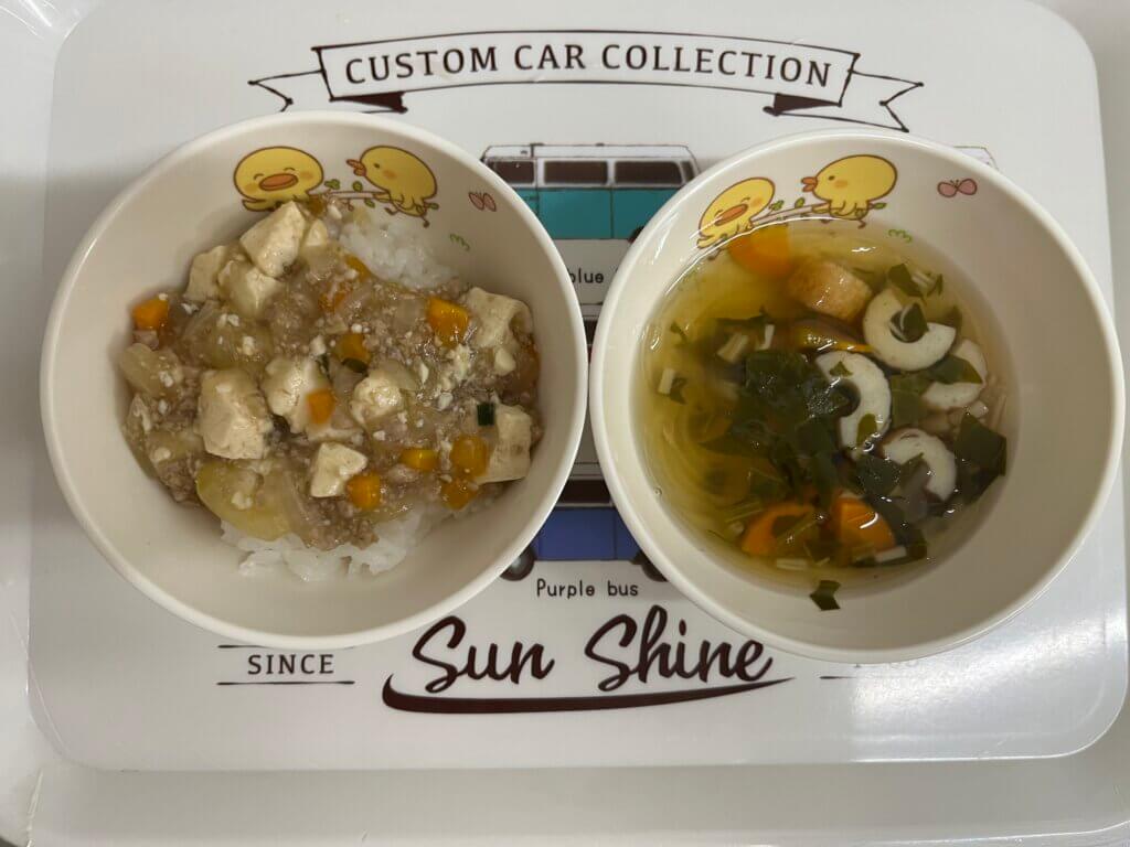 後期食ご飯マーボー豆腐野菜スープ 幼児食マーボー豆腐丼和風春雨スープ -